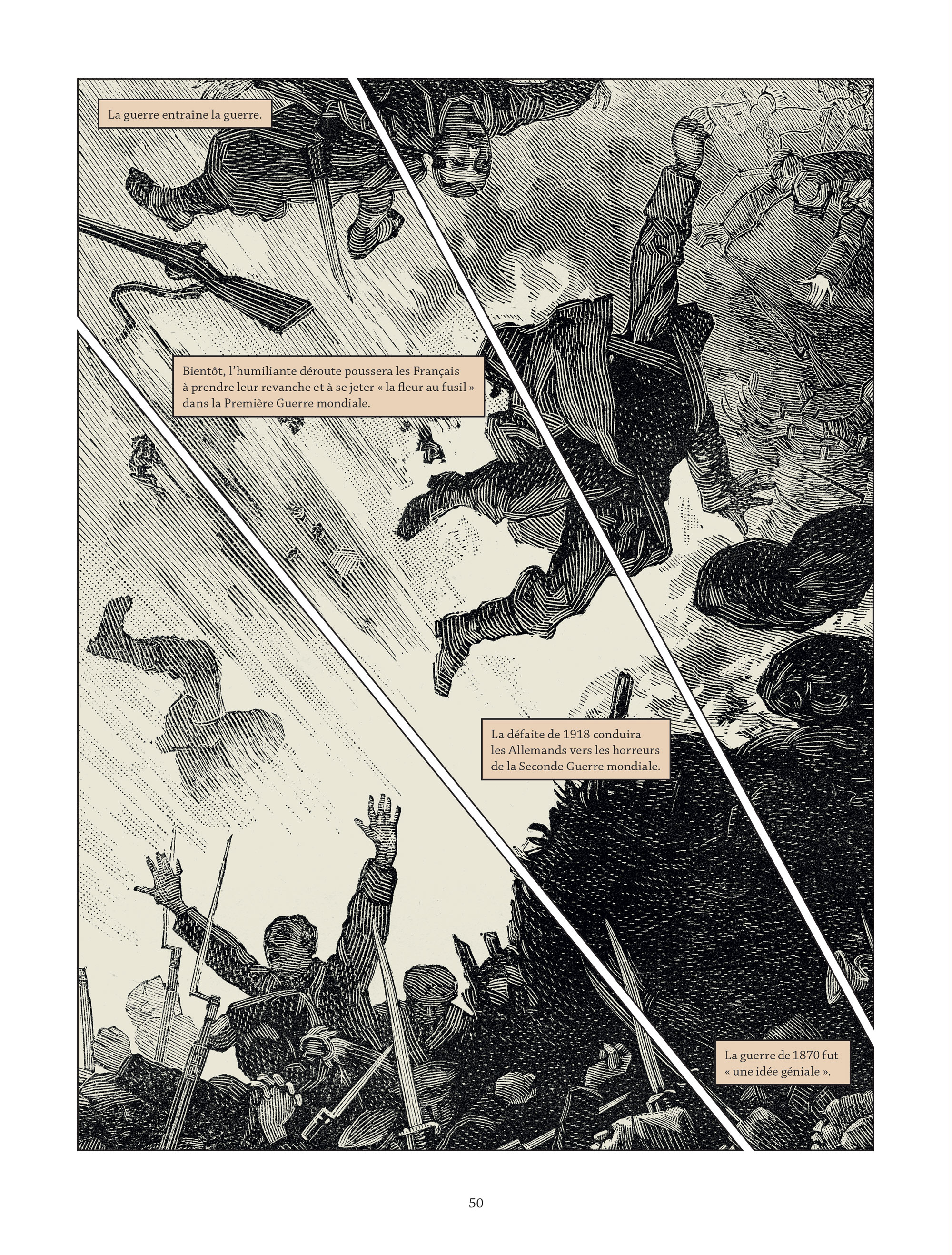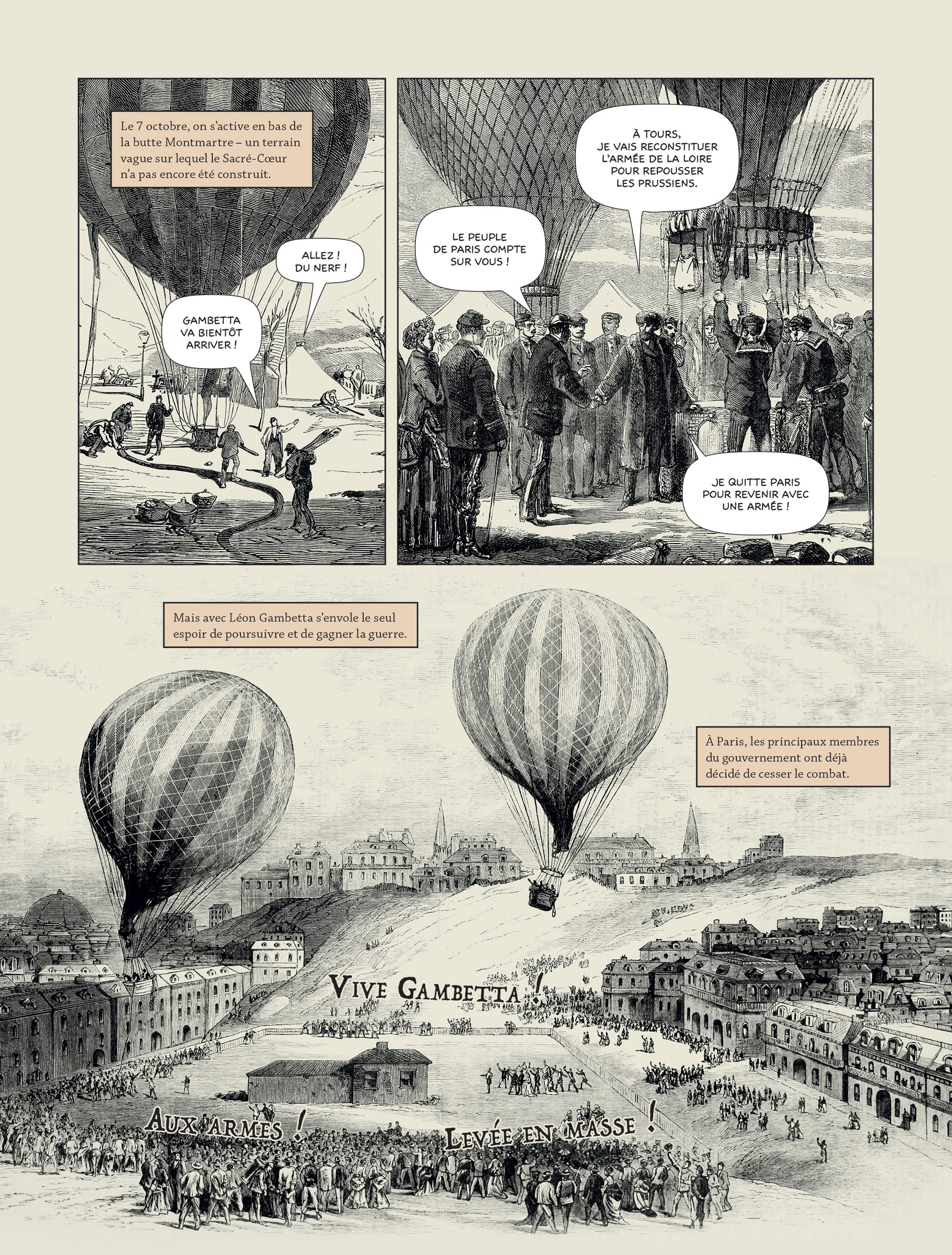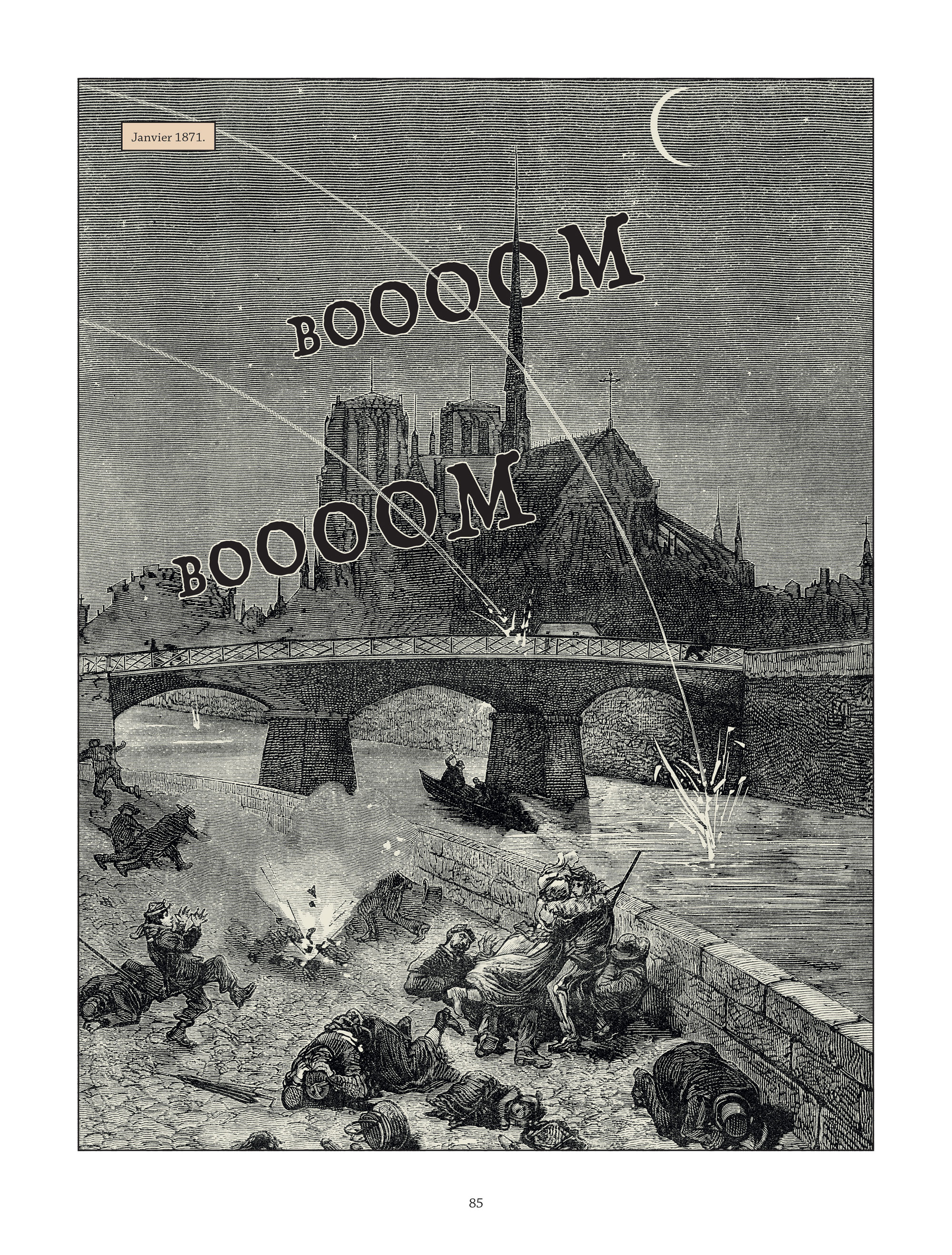 D’une part, j’ai choisi de faire une bande dessinée en utilisant exclusivement des dessins de l’époque de la Commune : des gravures, parues dans les livres et les journaux. Je ne les ai ni modifiés ni complétés par des dessins contemporains. D’autre part, j’ai choisi de raconter l’histoire de personnes réelles, en respectant fidèlement ce qu’elles ont vécu, sans jamais inventer ni romancer. Ainsi, je raconte l’histoire avec leurs mots et leurs images.
