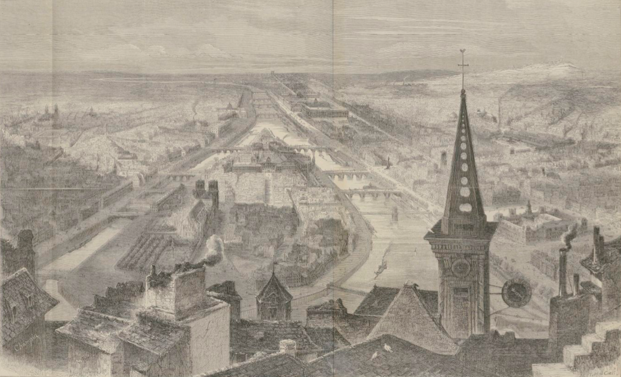 Au risque de déplaire à Raphaël, je vous montre (une mauvaise reproduction de) l’image complète, non recadrée. Le tout premier plan montre que le dessinateur, Jean-Jacques Champin (mort en 1860), était monté dans le clocher de Saint-Louis-en-l’Île, comme le titre de l’image l’indique. Elle est parue dans le livre Tableau de Paris, d’Eugène Texier en 1852 (on trouve ce livre sur Gallica) en 1852.
